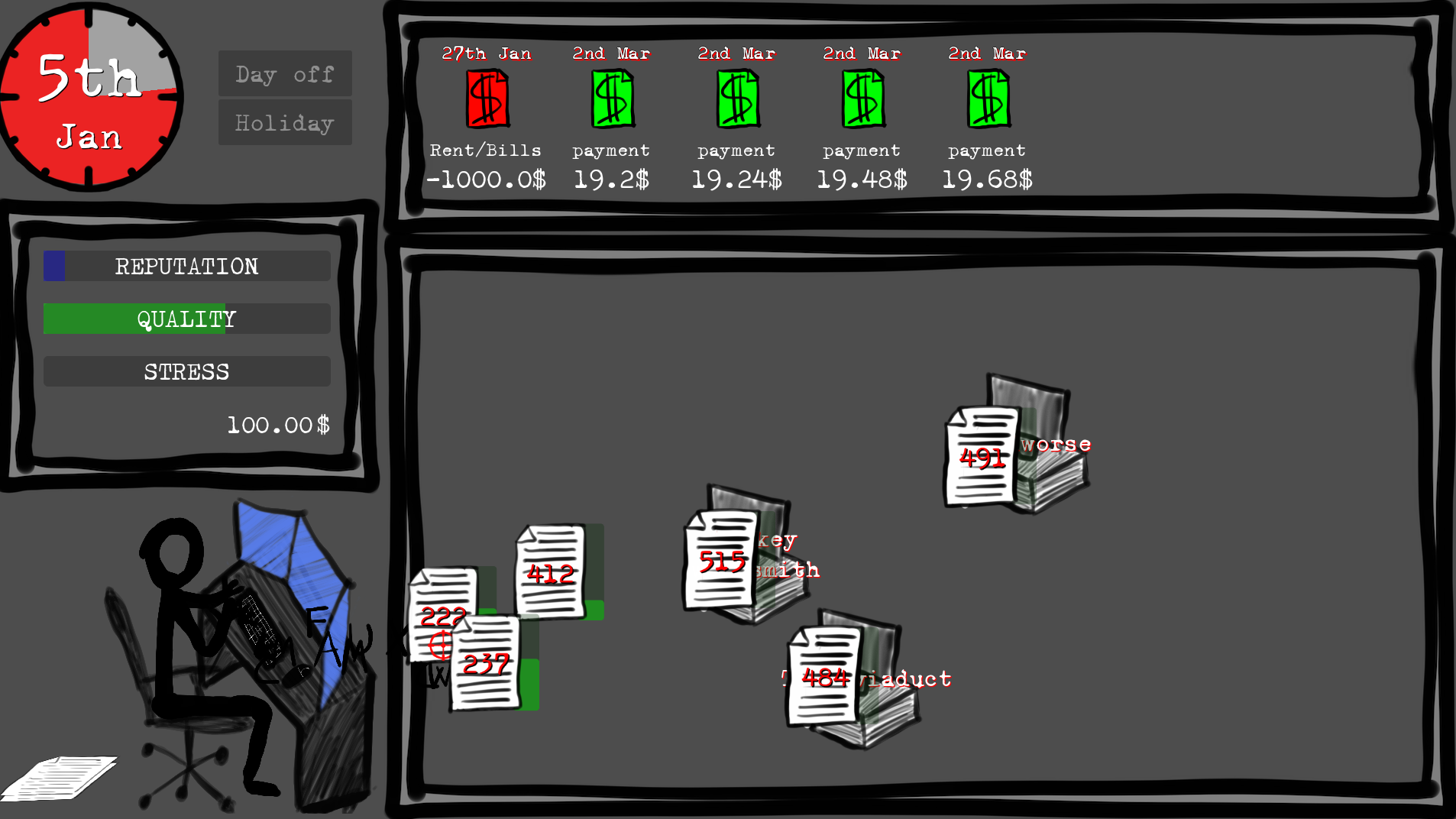 Climb your way toward the peaks of game localization glory, pick and nurture your clients (or tell them to get lost), juggle your expenses and customize your workspace to optimize time and productivity. Hop between a thousand translations, toss letters everywhere, and survive the relentless waves of task attacks!